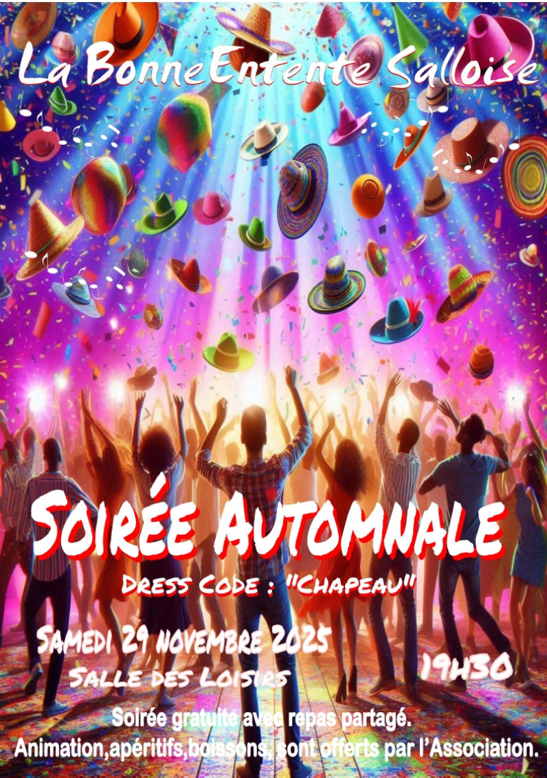 LES SOIRÉES FORMIDABLES de la BES Être sallois,  24 heures  chaque jour. Bonne Entente Salloise Bonne Entente Salloise Samedi 29 novembre  Soirée Automnale Soirée dansante avec Repas Partagé Dress code : «CHAPEAU»  19h30  Salle des LOISIRS Rue des Moulins - Salles d’Aude